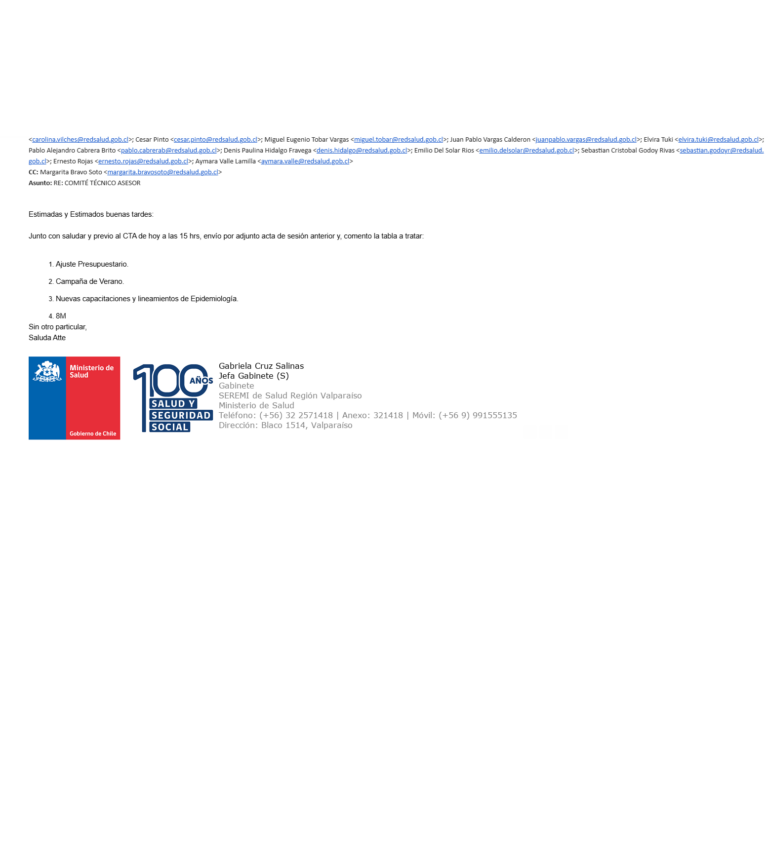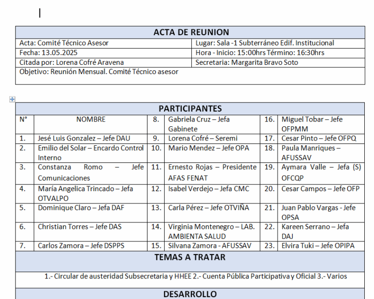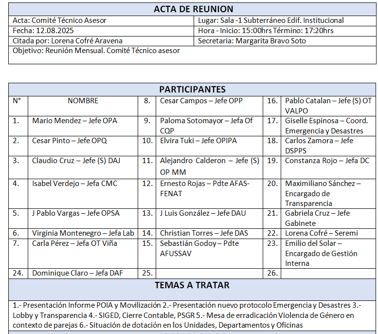 En el consejo se trataron temas anunciados en tabla [ 1)     Presupuesto 2025: Nuevos antecedentes;2)     Campaña Verano: DAS – Fiscalizaciones. PPT Cristian.3)     Lineamientos Epidemiología hacia Oficinas Territoriales.4)     Actividades desde la Conmemoración 8M.)] más otros temas en la sección “Varios”  [   Se está organizando las charlas de conflicto de interés, encuesta, se va a presentar en el próximo CTA. Constanza – Cuenta pública. 31 enero se envió 2 link – formulario estructura de recopilación información, otro link para registrar a las contrapartes. Fusión de la Unidad de Transparencia – Unidad de Atención de las Personas: Depto. de Atención de las Personas y Transparencia. ] Se deja a disposición acta de reunión.