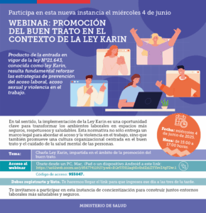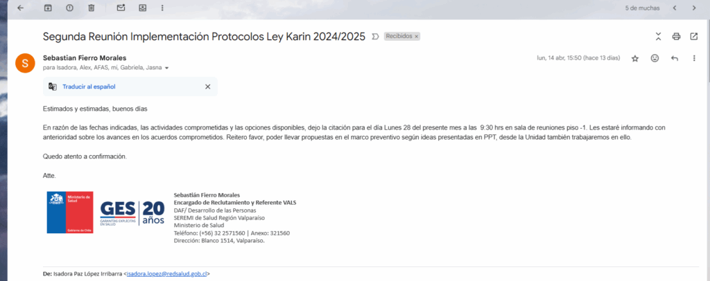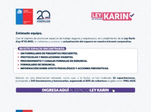 04.02.25; Se realizan difusiones de la Ley Karin en unidades de trabajo, y en una reunión en particular, se toma conocimiento del trabajo de actualización de protocolos, en particular donde se hace necesario integrar el protocolo de “Buen Trato Laboral” al protocolo de prevención existente. Se plantea la inquietud de la falta de lineamientos y certezas del nivel central dada la ausencia de plataforma de observatorio citada en el procedimiento y de la falta de definición del perfil de fiscales, todo ante la vulneración del principio de celeridad de los casos o denuncias en curso con altos atrasos. A nivel Federativo, en reunión del 03.02.25, se hace propuestas y se plantea la necesidad de una Política Nacional al respecto y a la adecuación administrativa para dar la celeridad que merece a los casos de denuncias. Se habla además sobre el factor ” infraestructura ” como un aspecto relevante en el clima laboral. Se adjunta ppt de las actividades de difusión.